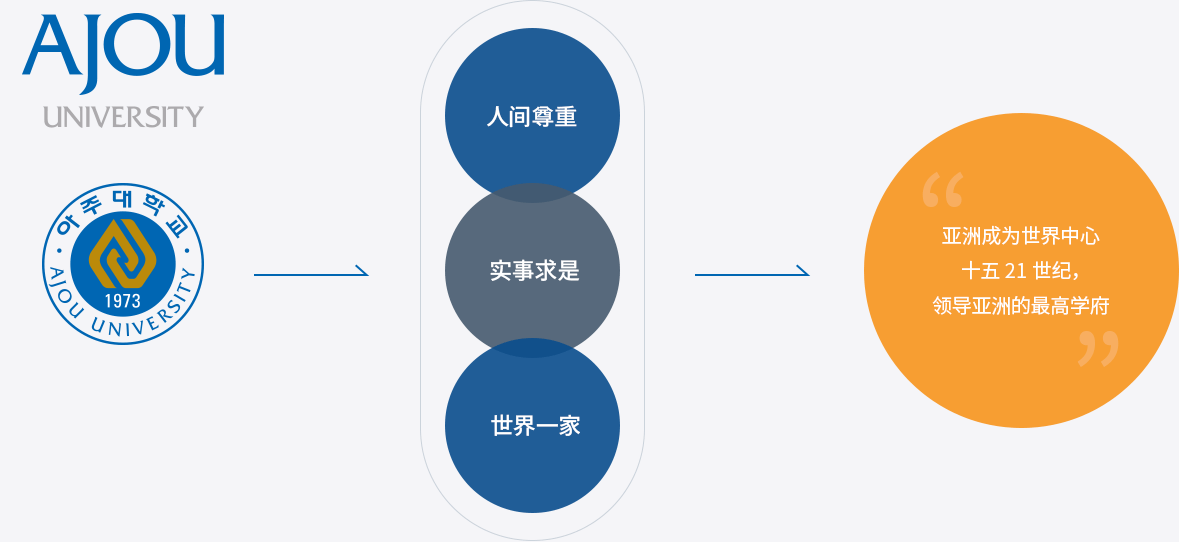 世界一家意在强调全球的和谐发展,教育学生走出韩国、迈向世界,同时接受来自外界的新事物,是亚洲大学教育培养年轻一代人才的首要原则。