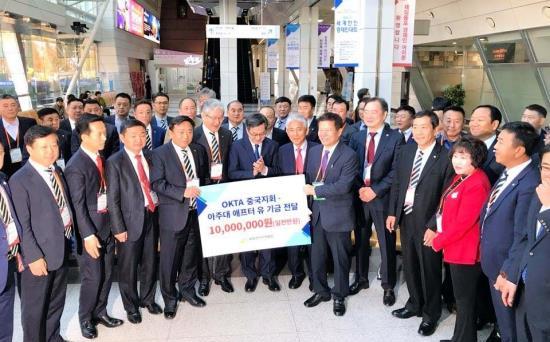 전세계에서 활동하는 한인 경제인들의 모임인 세계한인무역협회의 중국 지회장단이 우리 학교 파란사다리 프로그램에 사용해달라며 1000만원을 쾌척했다.기부금 전달식은 지난 31일 경남 창원 창원컨벤션센터에서 열린 ‘제23차 월드 옥타(World-OKTA, World Federation of Overseas Korean Traders Associations) 세계한인경제인대회’에서 진행됐다. 이 대회에 참석한 이광석 한중포럼위원장을 비롯한 20명의 월드 옥타 중국 지회장단은 우리 학교 오영태 산학부총장과 만나 기부금을 전달했다. 월드 옥타 중국 지회 소속의 기부자들은 해외 진출의 꿈을 가진 대학생들을 지원, 모국의 발전에 기여하고 아주대와 월드 옥타와의 지속적 협력을 위해 기부를 결정했다고 밝혔다. ‘파란사다리 사업’은 교육부와 한국장학재단이 주관하는 대학생 해외 연수 프로그램이다. 이 사업은 우리 학교가 지난 2015년 시작한 “AFTER YOU 프로그램 – 아주 글로벌 캠퍼스”를 모태로 시작됐다. 우리 학교는 수도권에서 유일하게 파란사다리 주관대학으로 선정되어 지난 여름 방학 4주 동안 100명의 학생을 미국과 중국 4곳의 대학으로 파견했다. 우리 학교 학생 80명, 인근 지역의 타 대학 학생 20명이 참여했다. 참가 학생 선발은 기존의 우리 학교 “AFTER YOU 프로그램”과 같이 학점·어학 등이 아닌 자기 개발과 미래에 대한 잠재력과 의지 등을 기준으로 이뤄졌다. 학생들의 교육 비용은 한국장학재단의 지원(70%)과, 우리 학교 유쾌한 반란 기금(30%)으로 마련됐다. 유쾌한 반란 기금은 이 프로그램의 취지에 동참한 교내외 인사들의 기부금으로 조성되어 왔다.우리 학교 오영태 산학부총장은 “이광석 위원장과 지회장들께서 프로그램의 취지에 공감하고 기부를 결정해주신데 대해 감사하다”라는 뜻을 전했다. 한편 오영태 산학부총장과 임군진 LINC사업팀장을 비롯한 우리 학교 관계자들은 ‘제23차 월드 옥타 세계한인경제인대회’에 참가해 향후 World-OKTA와의 지속적인 교류확대 및 협력 방안에 대해 논의했다.