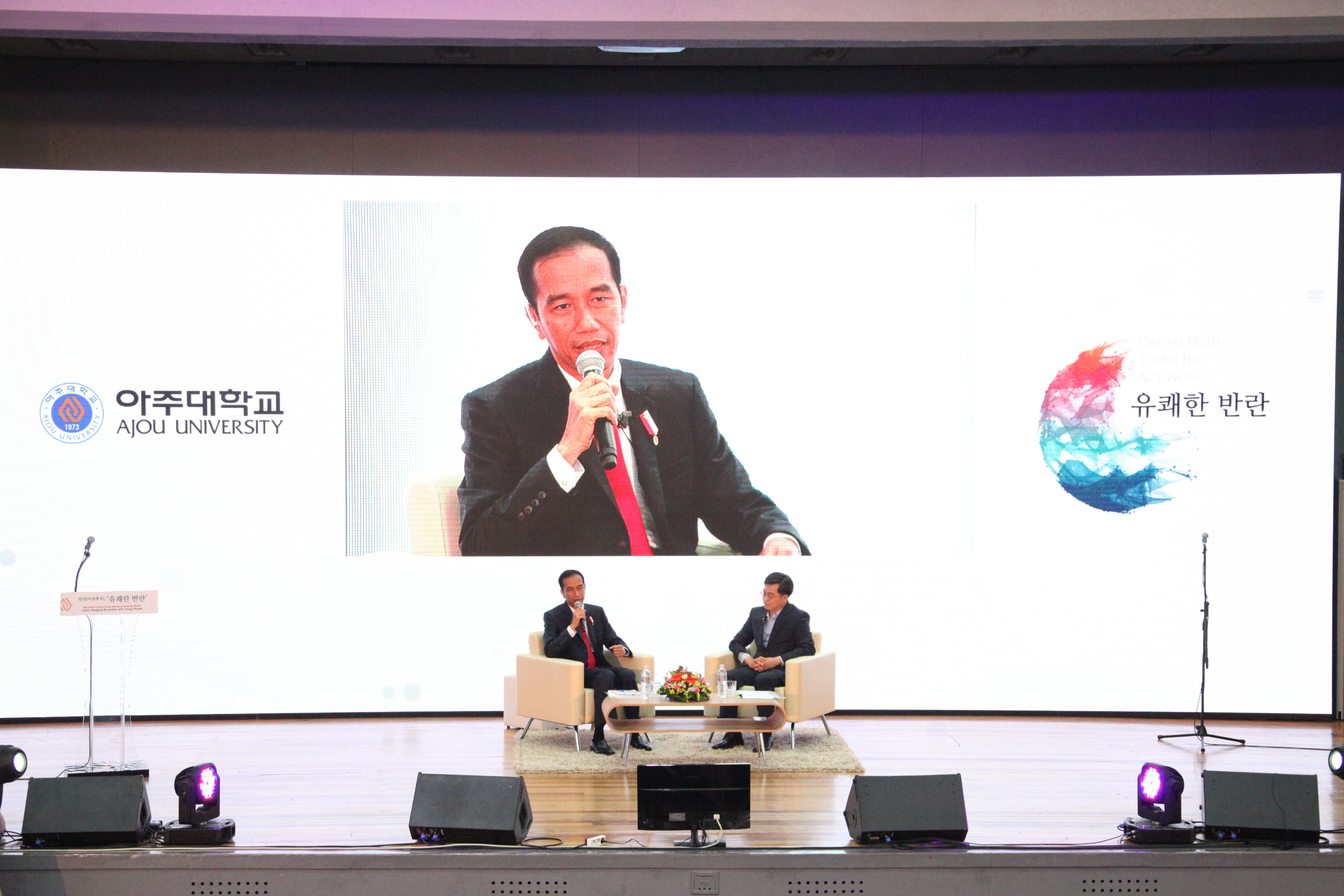 우리 나라를 국빈 방문 중인 인도네시아 조코 위도도(Joko Widodo) 대통령이 우리 학교에서 김동연 총장과 ‘청년들과 함께하는 유쾌한 반란’ 토크 콘서트를 열었다. 17일 오후 우리 학교 율곡관 대강당에서 열린 행사에는 우리 학교 학생과 인도네시아 유학생, 수원 지역 고교생 등 500여명이 참석했다. 남경필 경기도지사, 염태영 수원시장, 박광온 국회의원을 비롯한 지역 인사와 경제인도 함께 자리했다. 조코 위도도 대통령은 작은 시골마을에서 태어나 인도네시아 역사상 최초의 직선제 정권 교체를 이룬 첫 서민 출신 대통령이다. 우리 학교 김동연 총장도 상고를 졸업한 소년가장으로 야간대학을 나와 장관과 총장에 이른 입지전적인 인물. 이에 조코 위도도 대통령은 김 총장과 아주대가 추진 중인 ‘유쾌한 반란’에 대해 공감하면서 양국 청년들에게 꿈과 희망의 메시지를 전하고자 이번 토크 콘서트를 진행하게 됐다. 1시간 가량 진행된 토크 콘서트에서는 ▲꿈과 희망, 그리고 리더십 ▲소통 철학과 노하우 ▲청년들에게 보내는 조언 ▲아시아 시대 도래에 따른 양국의 교류·협력 등의 주제가 다뤄졌다. 조코 위도도 대통령은 “강가 작은 마을의 목수 부모님 밑에서 태어나 자라면서 여러 어려움이 있었다”며 “가난하고 부족한 스스로에 대해 잘 알았기에 다른 친구들 보다 2배, 3배 열심히 공부했고 젊은 시절 가구 사업을 할 때에도 밤을 새워 일하는 날이 많았다”고 말했다. 조코 위도도 대통령은 이어 “학교에서 배우는 것 뿐 아니라 삶에서 경험을 통해 배우는 것이 무척 중요하다”며 “가족, 친구를 비롯한 주변 사람들의 이야기를 ‘경청’하고 방학이나 휴일을 통해 다양한 경험을 쌓아 보라”고 조언했다. 그는 현장에서 답을 얻는 본인의 업무 스타일에 대해 소개하며 현장에서 사람들과 직접 이야기를 나누다 보면 그들이 어떤 어려움을 겪고 있는지 알 수 있고, 이를 통해 해결책을 도출하게 된다는 설명도 덧붙였다. 조코위 대통령은 인도네시아에 진출하고자 하는 한국 기업에 대한 조언을 청한 한 젊은 기업인에게 “최근 진행된 경제 개혁으로 외국 기업들의 투자 절차가 매우 간단해 졌다”며 “관련 기관에서 불친절한 응대를 받았다면 전화번호를 줄 테니 나에게 직접 연락해달라”고 답하기도 했다. 김동연 총장은 “조코 위도도 대통령은 여러 어려움 속에서도 강철 같은 의지와 집념, 그리고 따뜻한 마음과 탁월한 리더십으로 오늘날의 자리에 까지 오신 분”이라며 “한국 청년들 뿐 아니라 인도네시아를 비롯한 전세계 젊은이들에게 훌륭한 롤 모델이 될 것”라고 전했다. 이번 토크 콘서트는 우리 학교와 아시아기자협회(Asia Journalist Association, AJA), 아시아엔(AsiaN)이 공동으로 주최했다. 한편 본행사에 앞서 조코 위도도 대통령은 아시아기자협회로부터 「아자 어워드(AJA Award, 자랑스런 아시아인상)」를 수상했다. 아시아기자협회는 “조코 위도도 대통령이 인도네시아 대통령으로 취임한 이후 부패근절과 정치개혁 등을 통해 인도네시아를 아시아의 모델국가로 만들고 있는 점을 높이 평가했다”고 선정이유를 밝혔다.