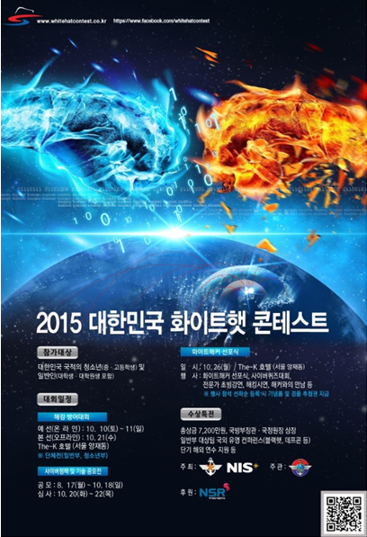 박형철(사이버보안학과) 학생이 국방부와 국가정보원이 26일 서울 양재동 더케이호텔에서 공동주최한 '2015 대한민국 화이트햇 콘테스트'에서 해킹방어대회 일반부 우수상을 수상했다. '2015 대한민국 화이트햇 콘테스트'는 사이버 안보 위협에 대한 대응책으로 사이버 보안 분야 영재를 발굴하고 육성하기 위한 목적으로 올해 3회째를 맞이하고 있는 행사다. 올해는 해킹방어대회를 비롯해 전문가 초빙강연, 해커와의 만남, 사이버 퀴즈대회 등 다채로운 행사가 동시에 펼쳐졌다. 화이트햇은 공익과 학업 등의 목적으로 정보 시스템에 대한 해킹을 시도하거나 해킹 대응 전략을 만드는 사람을 가리키는 말로, 화이트해커와 의미가 같다. 올해 해킹방어대회에는 총 1300명 464개 팀이 참가해 10일 예선을 치뤄 16개팀을 선발했으며 21일 본선을 치뤘다. 참가자들은 실제 사이버전 유사한 방식으로 문제 풀이를 하고, 운영진이 각 참가팀의 할당서버를 동시에 공격할 때 ‘얼마나 정확하고 빠르게’ 방어하는지를 평가했다. 해킹방어대회는 청소년부와 일반부로 나누어 진행됐으며 일반부 수상자는 다음과 같다. ▲대상 아몰랑 팀(KAIST 김종환, 박민준, 장대희, UpRoot 정도원) ▲최우수상 유리구슬 팀(건국대 정인갑, 안랩 김진현, 삼성SDSAP 현종석, SK 텔레콤 정협) ▲우수상 윤하팬클럽 팀(아주대 사이버보안학과 박형철, 포항공대 박병진, KAIST 박해송, 서울대 이대근)