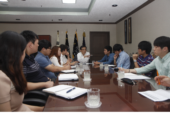안재환 총장과 허무관 총학생회장 등 학생대표 9명과의 만남이 4일 오전 11시 총장실에서 열렸다. 이번 간담회는 개강을 맞이해 총장과 학생들간의 격의를 없애고 학교발전을 위해 의견을 교환하자는 취지에서 개최됐다. 총학생회장을 비롯한 학생대표들은 각종 교내 사안들에 대해 건의 또는 질의하고, 총장으로부터 직접 답변을 들을 수 있었다. 총학생회장은 학생들이 많은 관심을 가지고 있는 중앙일보 대학평가의 진행상황에 대해 질문했고, 총장은 “경쟁대학들의 지표 차이가 근소해 경쟁이 치열하다. 우리학교는 여건상 상승 동력이 연구부분에 있다고 판단하고 이를 강화하기 위해 연구연보 제작, 우수논문상 시상 등의 정책을 펼치고 있다. 연구의 특성상 당장보다는 수년 내 결실을 맺을 것으로 기대한다.”고 말했다. 또 온수와 장애우 시설 등 노후시설 개선에 대해서도 “모두가 캠퍼스마스터플랜에 따라 실현 중에 있다. 단, 실현의 순서는 계획되어 있는 것이므로 원칙은 지켜져야 한다. 궁극적으로 아름답고 자랑할 수 있는 캠퍼스를 만들어야 하는데 학생들의 참여와 아이디어를 많이 제시해주었으면 한다.”고 안 총장은 말했다. 공과대학 학생회장은 “학교식당의 음식 맛에 대해 학생들의 불만이 많은 편이다. 하지만 개선이 잘 안 된다. 학교 측에서 조치가 있었으면 한다.”고 말했다. 이에 안 총장은 “교내 먹거리의 질이 매우 중요한데 저렴한 가격을 유지하면서도 맛있는 것을 찾으려 여러 방법을 시도하고 연구를 해봐도 마땅한 해결책을 찾지를 못하고 있다. 학생들이 구체적인 안을 학교에 제시해주고 학교와 같이 문제를 해결책을 찾았으면 한다.”고 제안했다. 약학대학 학생회장은 "아직 한 학년이 입학하지 않았음에도 불구하고, 약학관 내 강의실이 부족하다. 강의환경이 개선되었으면 한다."고 건의하자 "약학관 설계가 당초 계획에서 변경되었다는 이야기가 있는데 당초 계획대로 지어진 것이 맞다. 사실 약학대학의 공간사용은 다른 대학에 비해 비효율적인 측면이 있다. 하지만 학생들에게 쾌적한 환경의 강의실 제공은 최우선 사항이므로 2014학년도부터는 쾌적하게 수업받을 수 있도록 약학대학장, 교무팀 등과 협의하여 조치하도록 하겠다."고 약속했다. 그 외 총학생회 기념품 사업 협조, 학교 발전기금 모금 공감대 형성 등 각종 학교 문제들에 대해 총장과 학생대표들은 의견을 교환하는 시간을 가졌다. 학교 측 참석자는 총장, 학생처장 그리고 학생지원팀장이었으며 학생대표로는 총학생회 회장과 부회장 그리고 공과대학, 정보통신대학, 자연과학대학, 경영대학, 인문대학, 법과대학, 약학대학 학생회장이 참석했다.