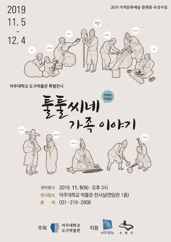 우리 박물관은 11월 5일 연암관 1층 박물관 전시실에서 특별전시 ‘툴툴씨네 가족이야기’ 전시 개막식을 진행 했다. 이번 특별전시는 경기도 지역의 문화예술 활성화를 위해 경기도와 수원시에서 지원하는 ‘2019 지역문화예술 플랫폼 육성사업’으로 아주대학교 도구박물관은 소장하고 있는 ‘도구’를 중심으로 한 특별전시를 진행한다.‘툴툴씨네 가족이야기’는 도구의 영문 표현인 ‘Tool(툴)’에서 이름을 딴, ‘툴툴씨’라는 인물의 3대 가족을 중심으로 조선시대 한 집안과, 시장의 모습이 연출 전시된다. 전시는 도구가 각기 어떻게 활용되는지 쓰임의 모습을 전시하여 관람객들의 이해와 재미를 도울 수 있도록 하였다. 또, 활동지가 비치되어 있어 전시 내용을 깊이 있게 학습할 수도 있다. 개막식은 박형주 총장의 인사말로 시작 되었으며, 이상국 박물관장의 박물관 소개 및 전시 개요 설명의 순서로 진행되었고, 개막을 알리는 커팅식이 있었다. 이후에, 내빈을 대상으로 전시에 대한 설명과 양석중 장인의 소목 작업 시현이 있었다. 개막식에는 교내에서 권순정 총무처장, 주일로 연구처장, 전시 자문위원으로 참여한 손정훈 물어불문학과 교수, 김종식 사학과 교수, 오상탁 교수가 참석했고, 외부에서는 수원화성박물관에 한동민 관장, 경기대학교 관계자, 한신대학교박물관 이남규 관장, 한국문화유산연구원 현남주 실장이 참석했다. 한편, 이번 특별전시는 12월 4일까지 진행될 예정이다.