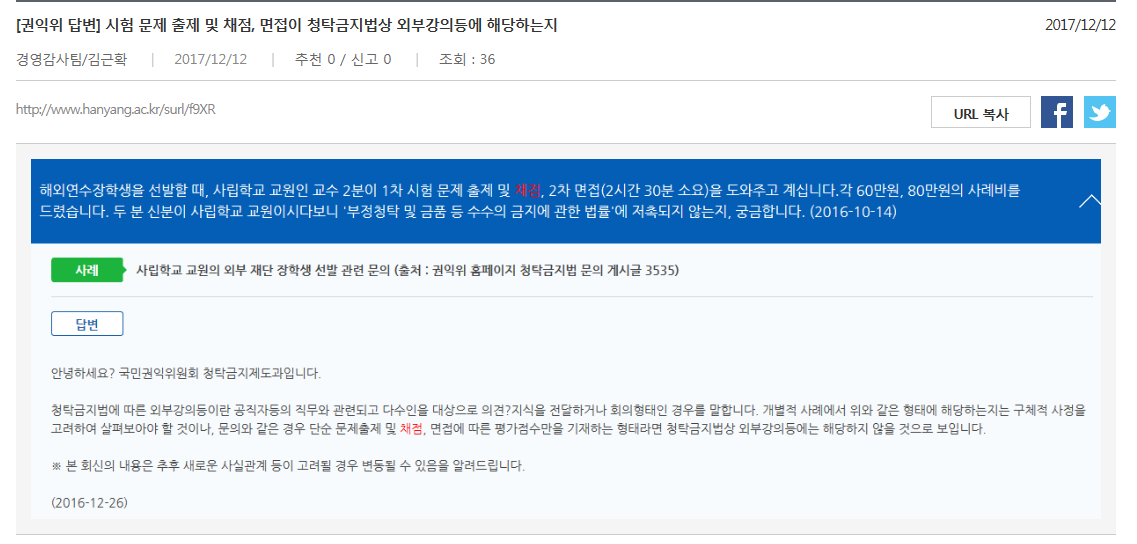 1. 관련:국민권익위원회 청탁금지해석과-344, 351, 394, 693, 769 (2018.02.28, 03.02. 03.09 ,04.19, 04.30.)