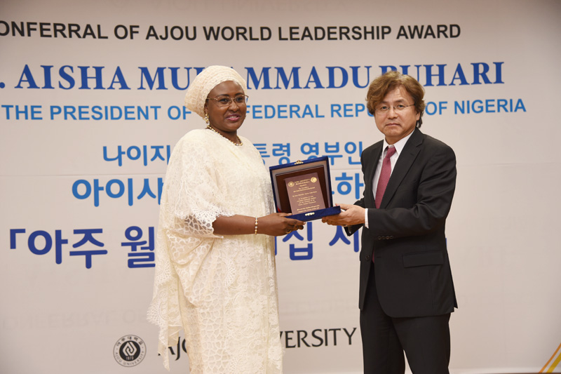 지난 7월, 아이샤 부하리 나이지리아 대통령 영부인 일행이 우리 학교를 방문했다. 학교는 부하리 여사에게 ‘아주 월드 리더십 어워드’를 수여했다.아이샤 부하리(Aisha Buhari) 여사는 아동·여성 복지를 위해 NGO를 설립, 운영하고 UN 에이즈 감염 예방 대사로 활동하는 등 관련 행보를 이어왔다.시상식은 14일 오후 우리 학교 율곡관 영상회의실에서 진행됐다. 행사에는 주한 나이지리아 대사관 관계자들과 박형주 총장을 비롯한 우리 학교 교수, 직원들이 참석했다. 나이지리아와 인근 국가에서 온 우리 학교 재학생들도 함께 자리했다. 아이샤 부하리 여사는 아동과 여성의 인권과 교육, 복지를 위해 NGO ‘퓨처 어셔드(Future Assured)’를 설립해 운영해왔다. 이러한 활동과 더불어 올 3월에는 UN의 에이즈 감염 예방 대사로 위촉되어 활동해왔다. 부하리 여사는 특히 모자 간 에이즈 감염을 막고, 에이즈에 감염된 어린이들이 적절한 치료를 받을 수 있도록 하는데 힘을 보태왔다. 부하리 여사는 수상 소감을 통해 “아주대학교에서 상을 수상하게 되어 매우 기쁘다"며 "NGO 퓨처 어셔드의 아동과 여성의 인권과 교육, 복지 확대를 위한 노력에 지속적인 지지와 응원을 부탁한다”고 말했다. 박형주 총장은 환영사를 통해 “아주대 전체 구성원을 대표해 의미있는 상을 수여할 수 있게 되어 큰 영광"이라며 "아프리카 여성과 어린이들의 인권 신장에 크게 공헌하고 있는 부하리 여사의 세계적 리더십에 존경을 보낸다”라고 전했다.한편 이날 시상식 이후에는 강의실 현판식 행사가 이어졌다. 다산관 205A호 강의실이 ‘아이샤 부하리 홀’로 명명됐다.