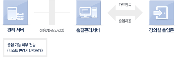 관리 서버(출입가능여부 전송(리스트 변경시 Update)) -> 전용망(485.422) -> 출결관리서버 -> 카드판독 & 출입허용 -> 강의실 출입문