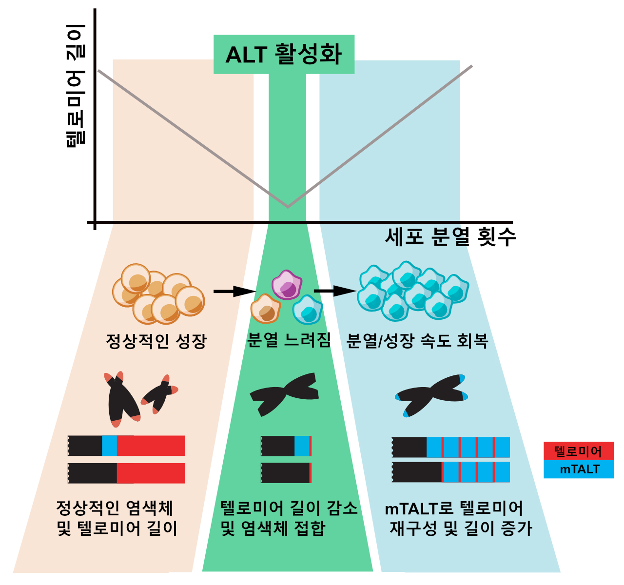 아주대학교와 서울대학교 공동 연구팀이 세포 노화 타이머를 제어할 수 있는 새로운 방법을 발견했다. ‘세포 분열의 타이머’로도 불리는 텔로미어가 새롭게 재구성된 사례를 발견한 것으로, 세포 노화의 비밀을 푸는 단서가 될 것으로 보인다. 아주대 박대찬 교수(생명과학과·대학원 분자과학기술학과)와 서울대 이준호 교수가 교신저자로 함께 한 이번 연구는 자연과학 분야 세계적 학술지인 <네이처 커뮤니케이션즈(Nature Communications, IF=12.121)> 2월17일자에 게재되었다. 우리 학교 대학원 분자과학기술학과 김다은 학생이 공동저자로 참여했다. 논문 제목은 ‘배아줄기세포에서 텔로미어 서열이 아닌 서열로 만들어진 텔로미어(Telomeres reforged with non-telomeric sequences in mouse embryonic stem cells)’이다. 우리 몸을 구성하는 세포는 분열하고 증식하며 생명 현상을 유지한다. 그러나 세포는 무한히 분열할 수 없으며 분열 과정에서 일정 부분의 유전 정보가 사라지도록 설계되어 있다. 텔로미어는 염색체 말단의 보호 구조로, 세포 분열 시 유전 정보를 대신해 사라지는 보호막 역할을 수행한다. 텔로미어의 길이가 일정 수준 이하로 짧아지면 세포는 분열을 멈추는 세포 노화 상태로 들어간다. 그러나 생식 세포나 줄기 세포, 암세포처럼 활발히 분열하는 세포는 ‘텔로머레이즈’라는 효소를 사용해 텔로미어의 길이를 유지하고 무한한 분열 능력을 가진다. 따라서 세포들이 정상적인 기능을 할 수 있도록 텔로미어의 길이와 분열 수를 조절하는 것이 중요하다. 특히, 텔로미어 유지 기전에 대한 정확한 이해는 부작용 없는 항암 전략, 노화 지연 등을 위한 이론적 기반이 된다. 일부 암세포에서는 ‘대안적인 텔로미어 유지기전(ALT, Alternative Lengthening of Telomeres)’이라는, 텔로머레이즈 효소를 활용하지 않고 텔로미어를 유지할 수 있는 기전이 발견되었다. 그런데 인간 암세포의 경우, ALT를 사용하더라도 일반적인 반복서열을 지닌 텔로미어의 사례만 보고되어 있었다. 연구팀은 이러한 일반적인 반복서열을 보이는 텔로미어가 아닌 다른 구성을 가지는 형태로 재구성된 사례를 포유류 모델 최초로 확인하는 데 성공했다. 텔로머레이즈가 불활성화된 생쥐 배아줄기 세포 배양 중 아주 일부의 세포에서 ALT가 활성화되어 정상적인 분열 속도를 회복한 것. 이때의 ALT 세포는 단순반복 서열이 아닌 독특한 서열이 증폭된 구조를 보였다. 박대찬 교수 연구팀은 이를 ‘mTALT (mouse template for ALT)’라고 명명했으며, 이를 통해 인간 암세포에도 또 다른 형태의 텔로미어가 존재할 가능성을 찾아냈다. 또한, 연구팀은 ALT가 실제 작동하는 과정을 추적하기 위해 텔로미어 길이가 정상적인 세포, 노화 상태에 있는 세포, ALT가 활성화된 이후의 세포 등 다양한 시점의 생쥐 배아줄기 세포에 유전체, 전사체, 단일세포 전사체, 단백질체 분석 등 다양한 오믹스 기법을 활용했다. 이를 통해 ALT 세포의 분자적인 특징을 규명하는 데 성공했다. 연구팀은 "이번 연구를 통해 인간 암 세포에서 또 다른 형태의 텔로미어가 존재할 가능성이 드러났다“며 ”텔로미어라는 개념이 염색체 끝 부분의 반복서열구조와 텔로머레이즈 효소로 이루어진 단순 공식이 아니라 염색체 끝을 보호하는 다양한 기전을 총칭하는 말로 확장되는 데 기여하게 됐다"고 밝혔다. 이번 연구는 과학기술정보통신부와 한국연구재단이 추진하는 신진연구자지원사업, 중견연구자지원사업 지원으로 수행되었다.세포 분열에 의한 텔로미어의 변화와 ALT 기전 활성화 설명 모델