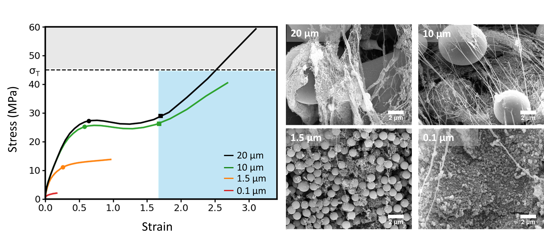 (왼쪽) 입자 크기에 따라 PTFE 바인더가 받는 응력과 변형 거동이 달라짐을 보여주는 시뮬레이션 결과. 특정 크기(10μm)에서 섬유화가 가장 잘 일어남이 확인됨