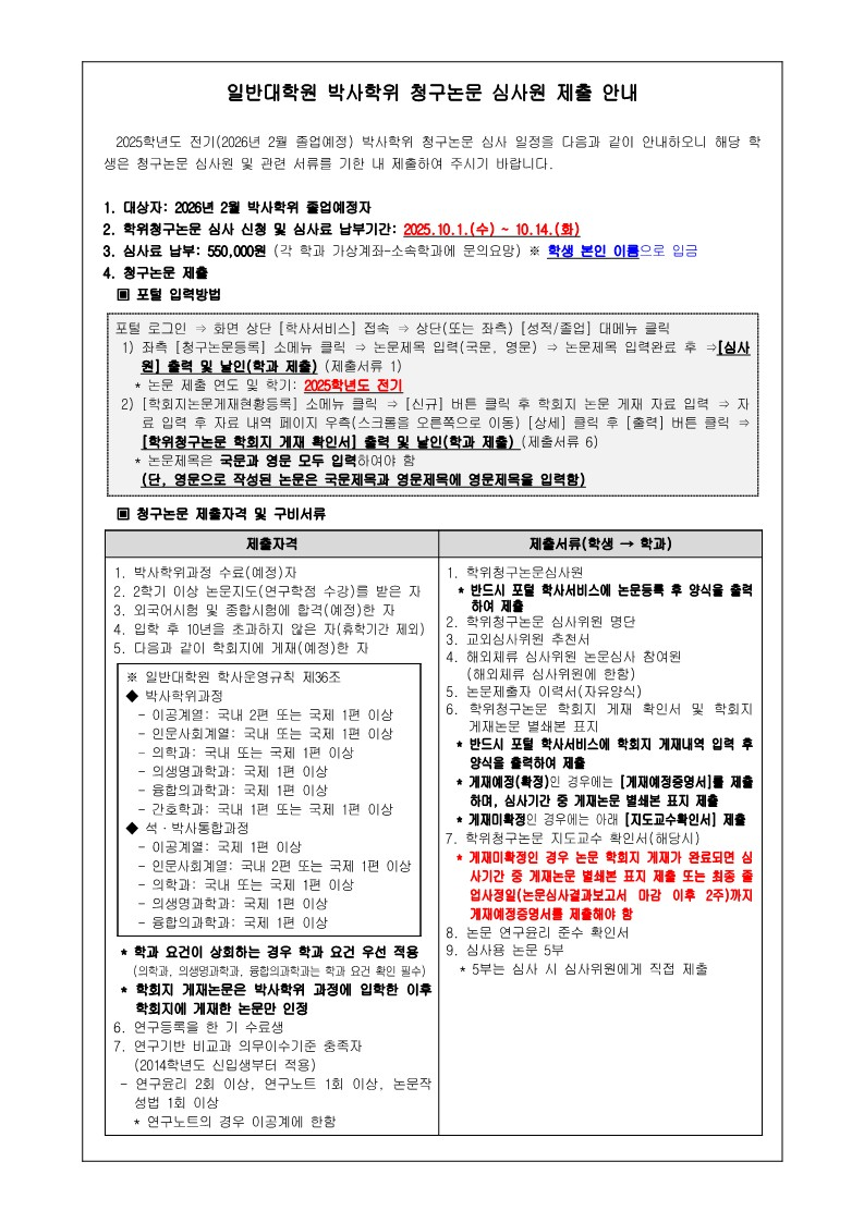 2025학년도 전기(2026년 2월 졸업예정) 일반대학원 박사학위 청구논문 심사 일정을 다음과 같이 안내하오니, 해당 학생은 청구논문 심사원 및 관련 서류를 기한 내 제출하여 주시기 바랍니다. (*심사원 제출시 심사료 납부 필수)