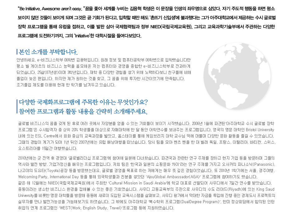 Home   Special Theme Grobal Univ. Ajou People in Ajou Zoom in Ajou Ajou News
